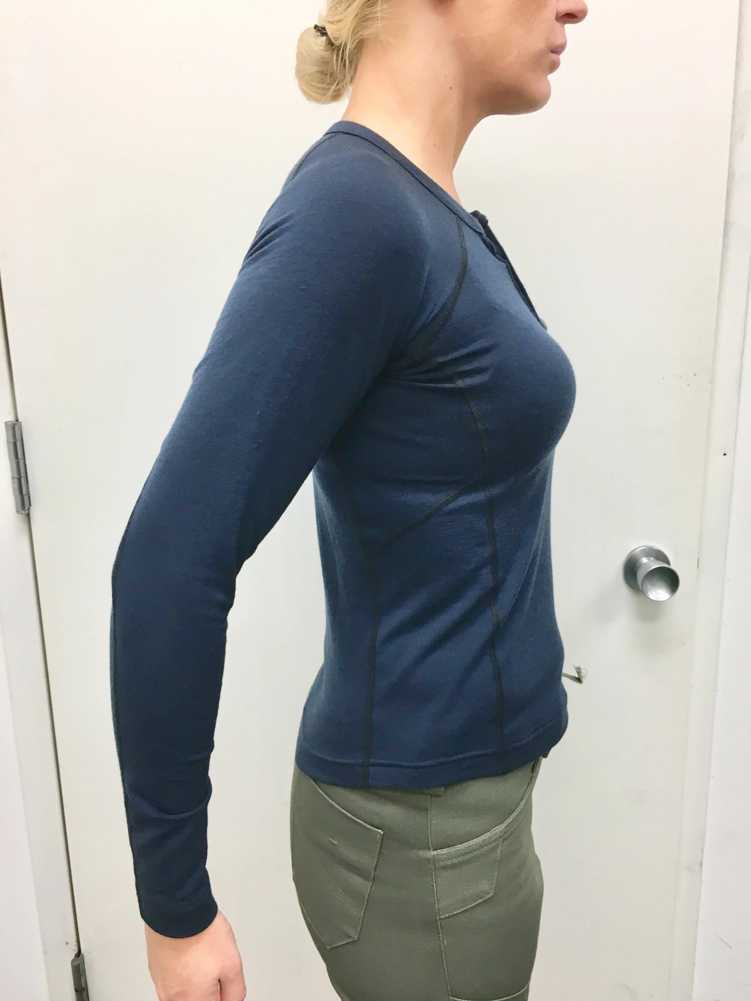 Sister style to Tad’s Huntsmen Henley the goal was to not shrink it and pink it. We elevated the women’s version with a raglan sleeve, gusset underarm, a baseball hem, lengthen the placket, and mitered the bottom edge making it unique.